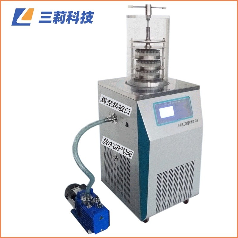 LGJ-12壓蓋型冷凍干燥機配置:主機+防返油真空泵+壓蓋型凍干罩+3層不銹鋼物料盤;
