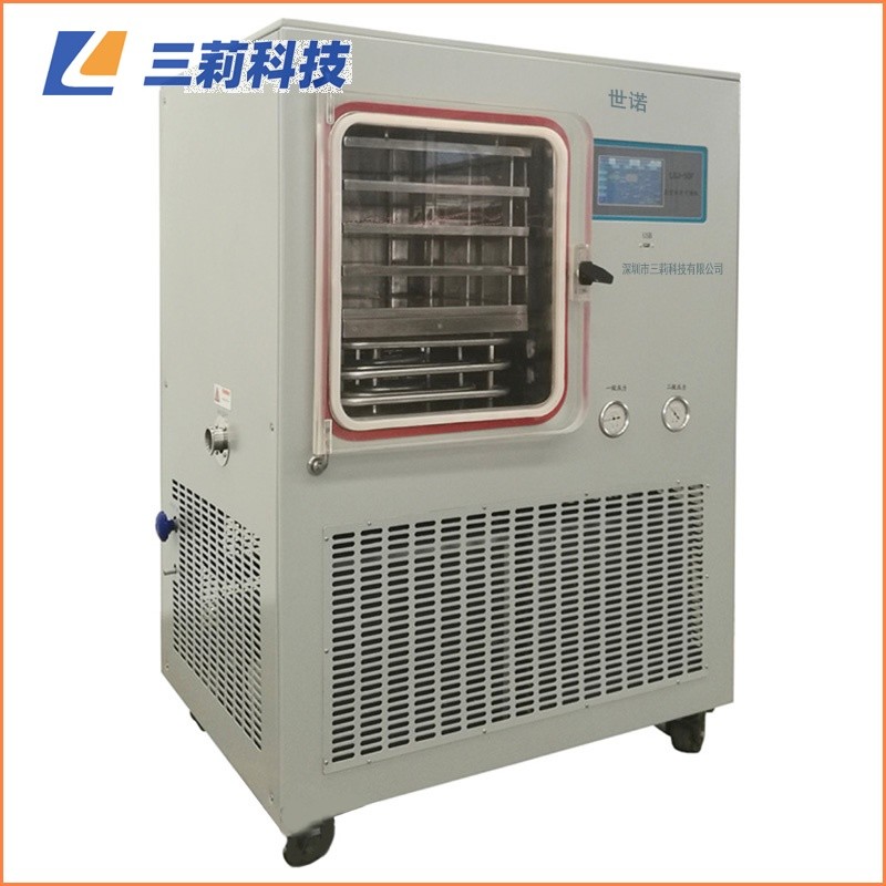 LGJ-50F(硅油加熱)普通型冷凍干燥機配置:方倉主機+防返油真空泵+硅油加熱功能+4層不銹鋼物料盤,凍干面積:0.7m2;