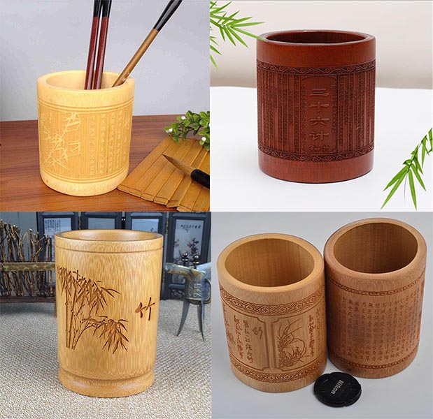 筆筒大部分是采用竹木材料制作的,以天然竹木作為原材料,后期借以現(xiàn)代激光雕刻技術(shù)進行雕琢,尤其是雕刻一些詩詞歌賦、字畫書法,給書房更是增添不一樣的文化氛圍。