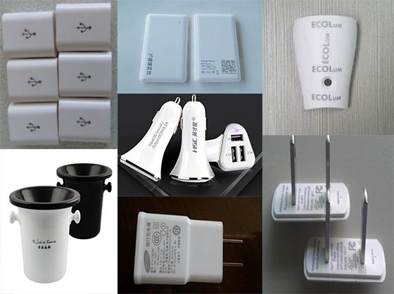 手機、平板、電器塑料充電器等電子器件的外殼的商標、參數標識。