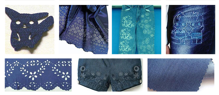 激光切割牛仔服是用聚焦鏡將CO2激光束聚焦在布料表面使材料熔化,同時用與激光束同軸的壓縮氣體吹走被熔化的材料,并使激光束與材料沿一定軌跡作相對運動,從而形成一定形狀的切縫。