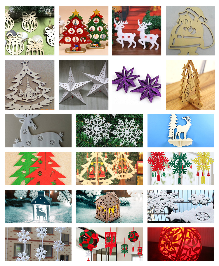大中型激光切割機,適用材料廣泛,深淺度可調,經久耐用。圖案不受限制,開版迅速,產能大,能滿足圣誕用品批量生產要求。可根據情況選配機型,如需金屬裝飾品加工,可選擇2513激光混切機。